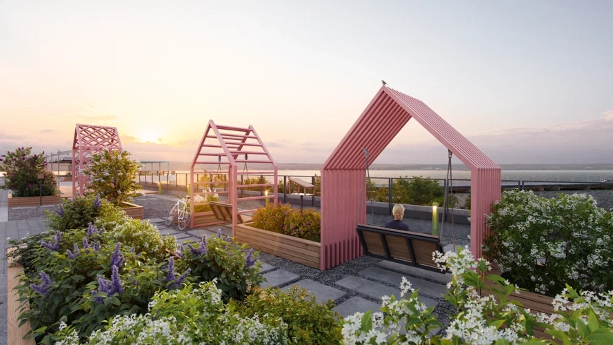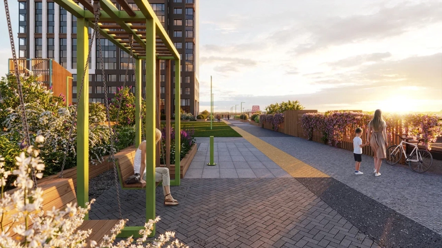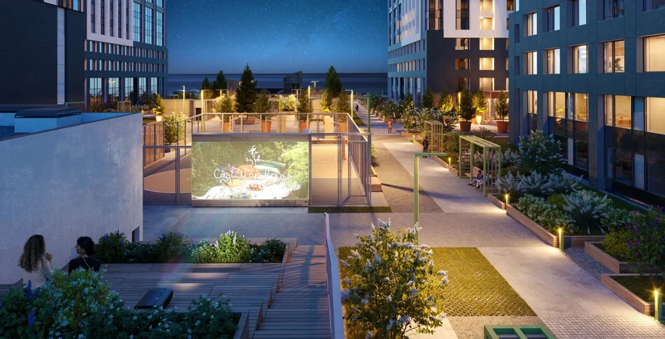 2 гектара благоустроенной придомовой территории: кинотеатр под открытым небом, аллеи для прогулок, шезлонги и гамаки, зоны для пикника