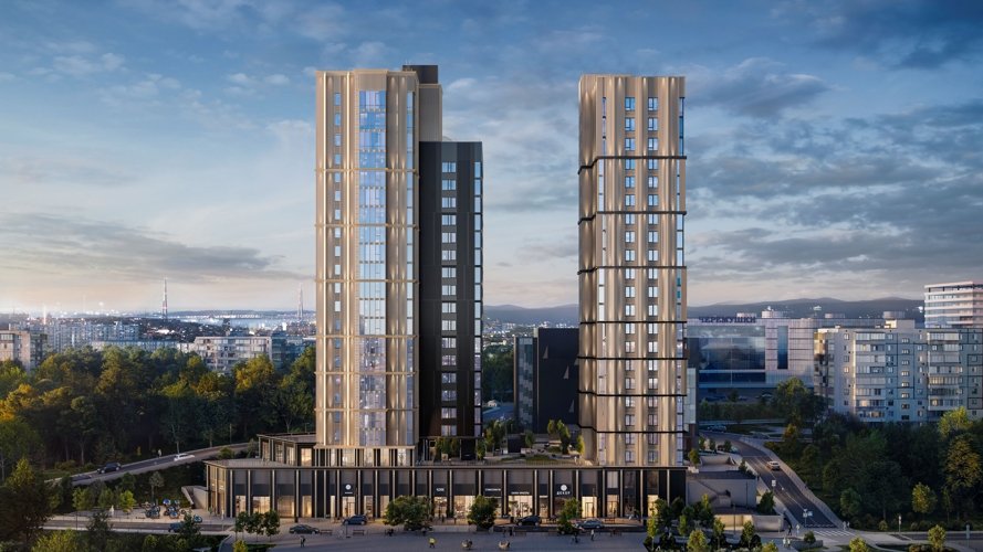 Черный насыщенный цвет ягоды применяется в стилобатной части и некоторых элементах фасада, а светлые оттенки дерева применили в высокой части зданий. Комфорт складывается из деталей, и в ЖК позаботились о каждой из них.
