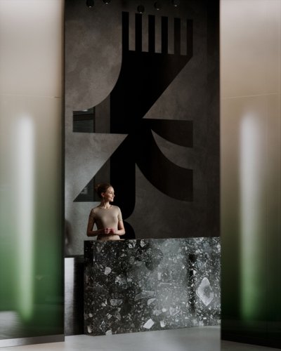 Нижние этажи комплекса облицованы натуральным гранитом светло-серого и темно-серого цветов с шероховатой, бучардированной поверхностью, а панорамное остекление квартир выполняется с энергоэффективными и солнцезащитным стеклопакетами в алюминиевых конструкциях.
